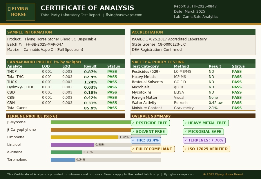 Flying Horse Brand Sample Certificate of Analysis (COA) | Third-Party Lab Tested | Batch FH-SB-2025-MAR-047